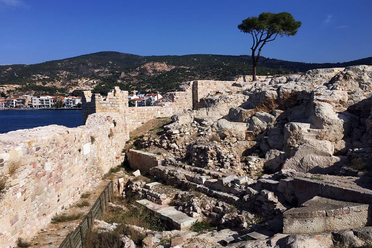 The Kybele temple is dated to around 580 BCE. The rocky coast is where niches are located for offerings to be made for the goddesses. On top of the rocks is built a four-layered city wall. The earliest masonry is the Archaic unmortated wall, then it is fitted with Roman walls with lime mortar, and later in the Genoese and Ottoman periods Brickdust (Khorasan) mortar is used to fortify the city walls.